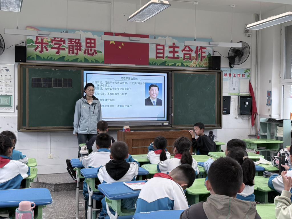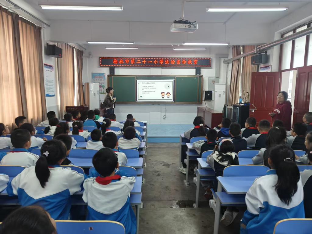 针对不同年级学生的认知特点,团队精心设计了教学内容,精准化的普法方式,有效提升了法治宣传的针对性和实效性。在榆林市第二十一小学,团队通过丰富地互动方式,将习近平法治思想、《民法典》、《未成年人保护法》等法律知识融入法治课堂,在现场通过“知识竞答”等形式,向中高年级学生讲解了宪法的重要性,并重点普及了防范校园欺凌的知识以及有效的自我保护方法。