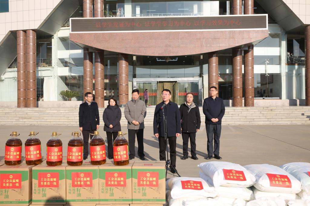 慰问组在校园内举行了集中慰问仪式。卜耀军代表学校党委、行政及全体教职工,对省总工会慰问组的到来表示热烈欢迎和诚挚感谢,并向寒假期间坚守岗位的一线教职员工致以崇高敬意。他勉励大家将工会“娘家人”的关怀厚爱,转化为干事创业的强大动力,为加快建成特色鲜明的一流应用型大学贡献更大力量。王永岗在仪式上阐述了工会“送温暖”品牌工作在服务大局、关爱职工方面的重要意义,并强调了教育工作者在实施科教兴国战略中的关键作用。他表示,工会组织将始终做广大职工最可信赖的“娘家人”,努力为大家排忧解难,支持大家建功立业。仪式上,慰问组与校领导共同向150余名来自后勤保障、安全保卫、管理服务等岗位的一线教职工代表发放了慰问礼包。集中慰问后,慰问组深入校园,专程看望了“陕西省先进工作者”屈雷老师及两名一线职工,与他们亲切交谈,详细询问其工作、生活及家庭实际情况,感谢他们的辛勤付出,叮嘱他们保重身体,并送上了慰问金和慰问品。这份“雪中送炭”的关怀,让受助职工深受感动,倍感温暖。