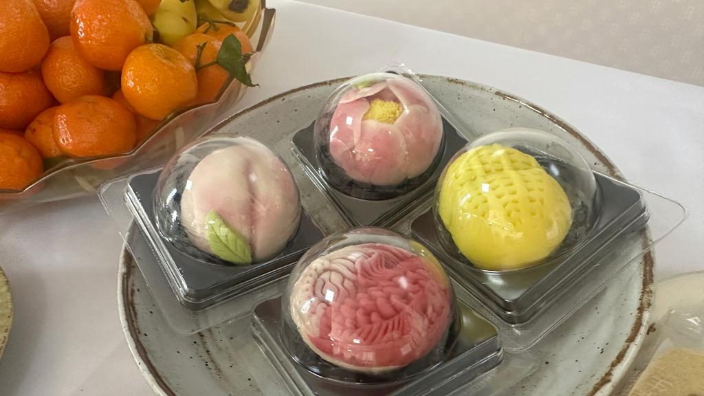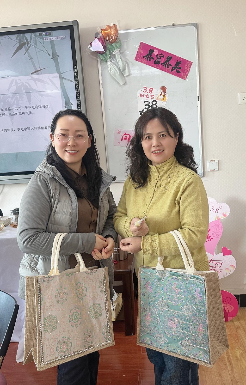手作结束后,现场还设置了作品展示与茶叙环节。老师们佩戴着亲手制作的胸针,手持雅致的宋锦包拍照打卡,留下节日的美丽瞬间。茶点配香茗,悠然品味间,大家聚在一起,分享手作心得,畅聊工作生活,欢声笑语中洋溢着节日的温馨与美好。